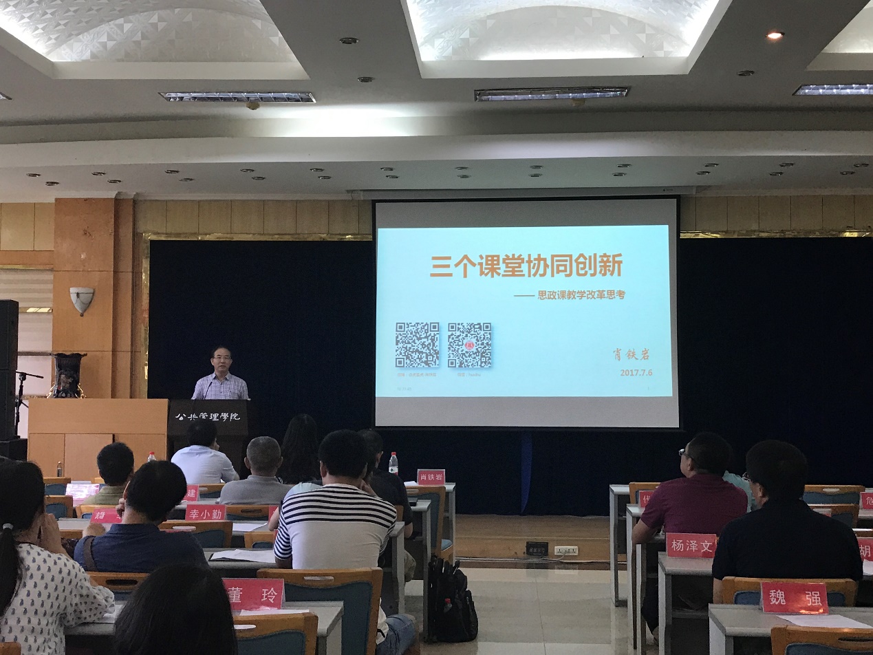 根据教育部“高校思想政治理论课教学质量年”的相关要求,在前期调研相关职能部门、任课教师和学生调研的基础上,于2017年7月6日下午3点在学院二楼多功能厅举行了思想政治课质量建设研讨会。学院全体教职员工出席研讨会,学院党委副书记(主持工作)罗滌主持会议。