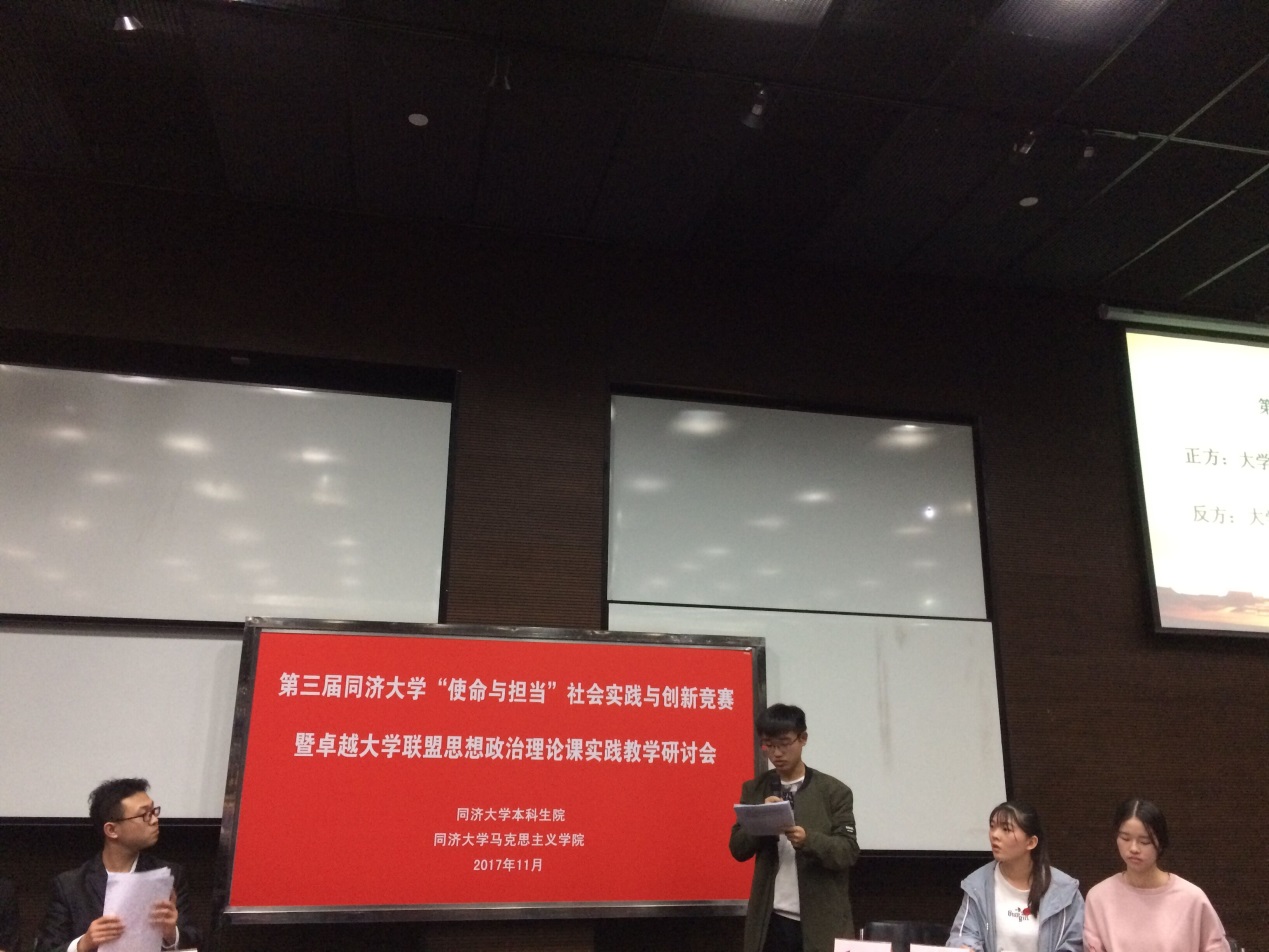 “‘使命与担当’社会实践与创新竞赛”作为同济大学思想政治课实践教学的创新探索,力求使思政课的思想教育与大学生综合素质的提升相结合,以面向本科生的4门思政课——《马克思主义基本原理概论》、《毛泽东思想和中国特色社会主义理论体系概论》、《中国近现代史纲要》、《思想道德修养与法律基础》为基础,将“辩论赛”这一大学生喜闻乐见的形式引入到竞赛中,辩题注重理论与重大现实问题相结合,注重世界观、认识论与方法论的结合,极大地激发了同济学子思考和表达的愿望,受到了同学们的热情响应。