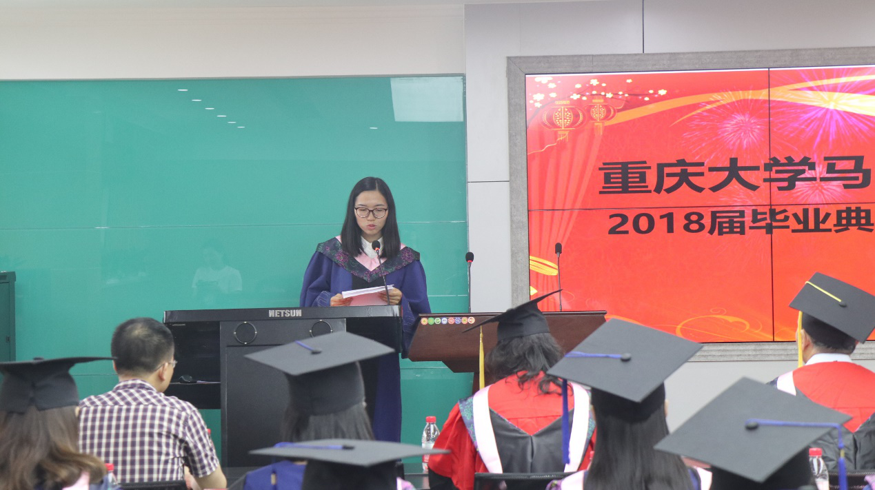 黄冰凤代表2018届硕士研究生在毕业典礼上发言,她回忆了在重大足球比赛生活、学习、研究的点点滴滴。她难忘重大,难忘她的导师欧可平教授让她懂得了成长,收获了荣誉;她难忘身边的老师和同学,因为他们让她学会了心怀梦想、潜心学术;她难忘校训“耐劳苦、尚俭朴、勤学业、爱国家”,是重大的校训让她不忘初心,砥砺前行。