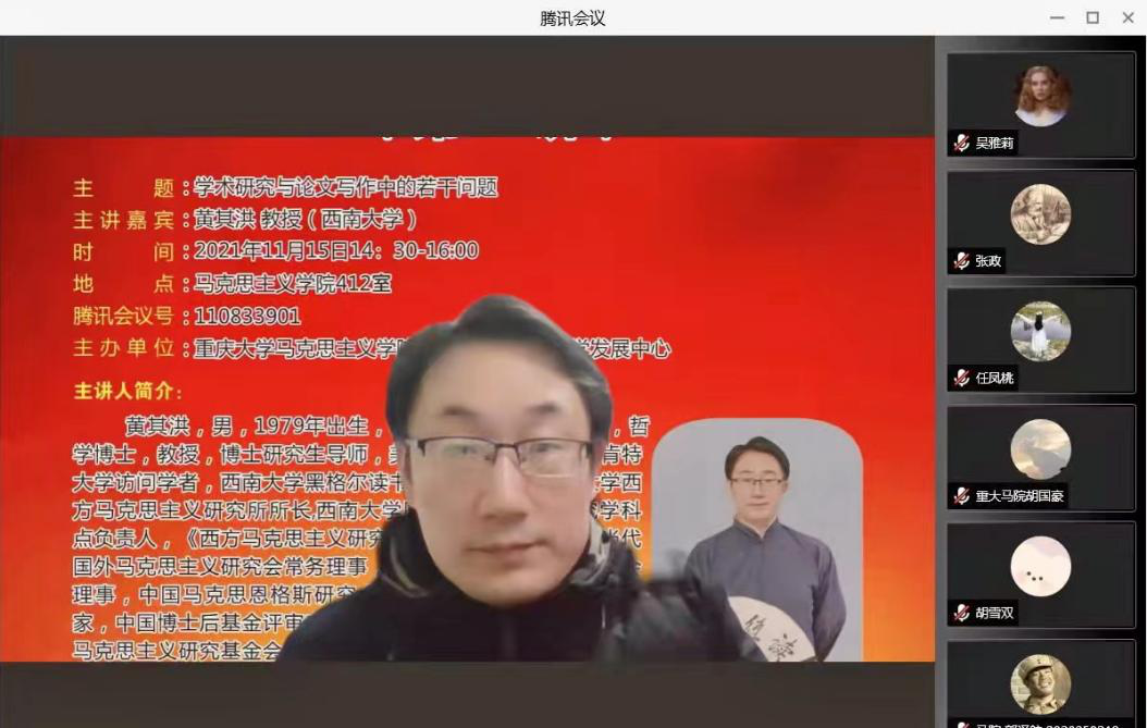 举行第二十七讲“红岩讲坛”活动,西南大学黄其洪教授以“学术研究与论文写作中的若干问题”为主题作了学术讲座。本次讲座采用线上腾讯会议、线下课堂讲座的方式同步进行,讲座由足球比赛